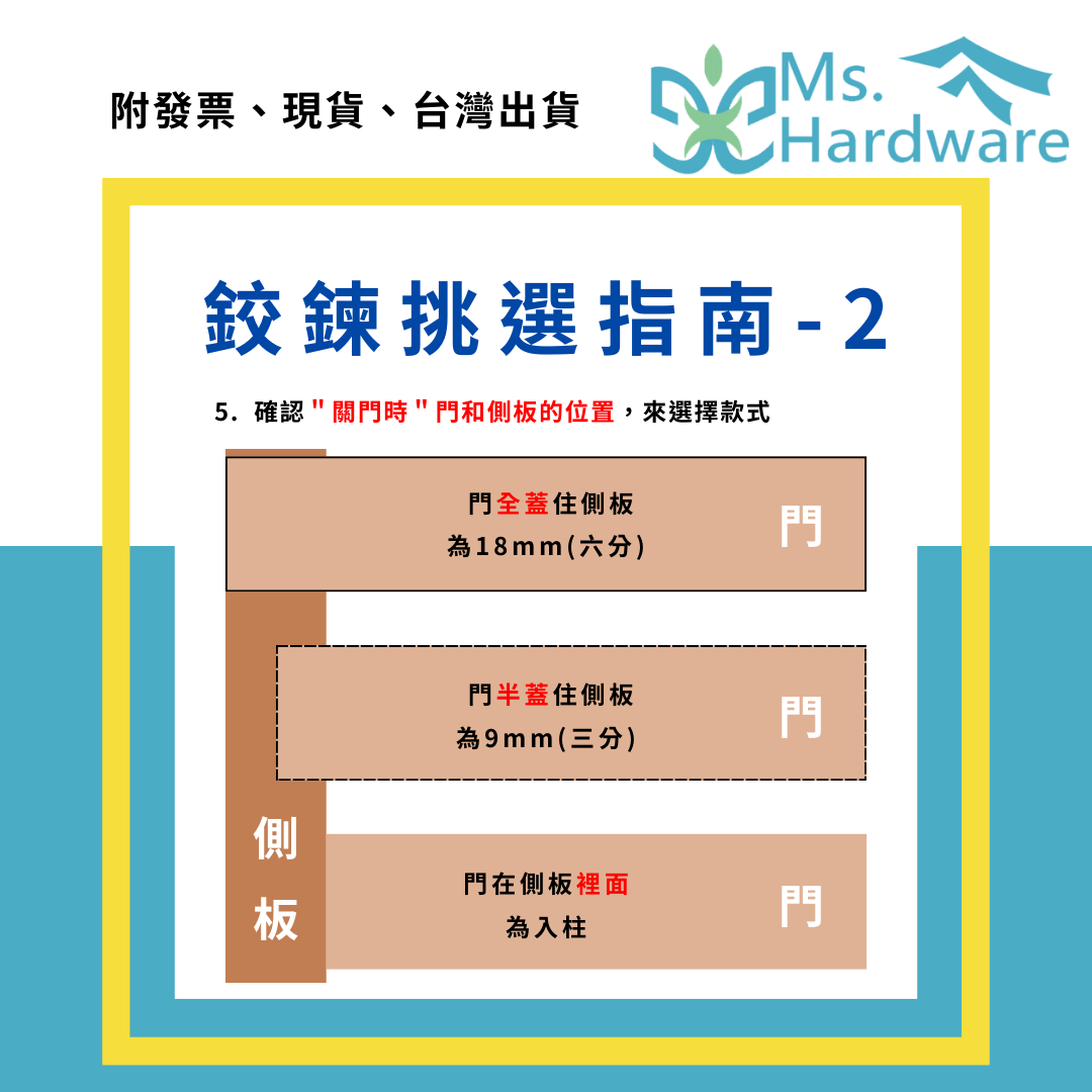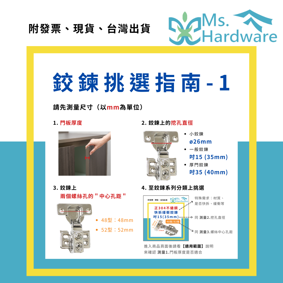 如果不確定挑選的鉸鍊款式是否正確,您可以提供測量數據與多張照片,加入Line @mshardware,讓五金小姐來解決您的困擾