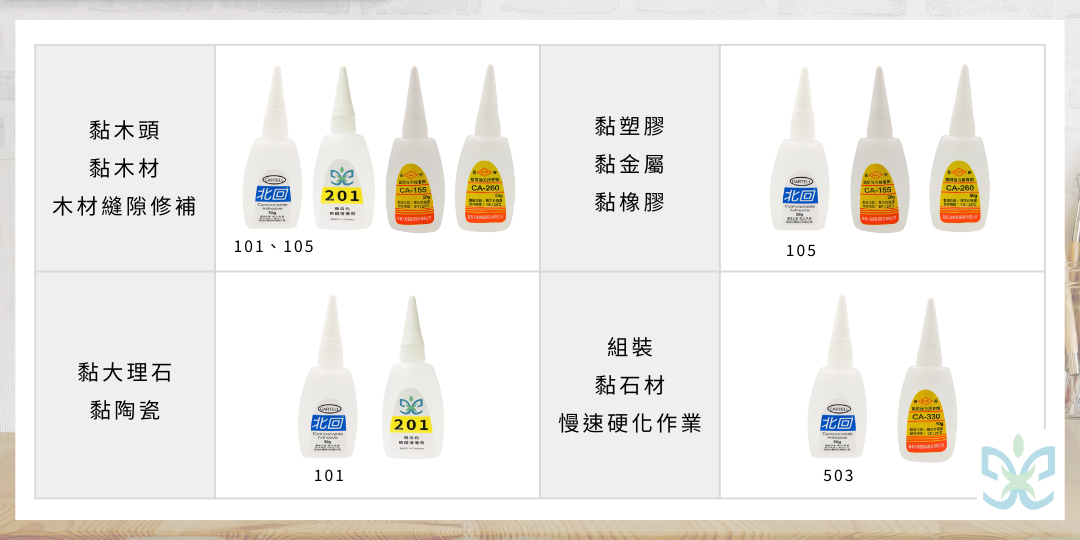 黏木頭、黏木材、木材縫隙修補:北回快乾101、北回快乾105、MS. 低白化快乾201、長春快乾CA-155、長春低白化快乾CA-260